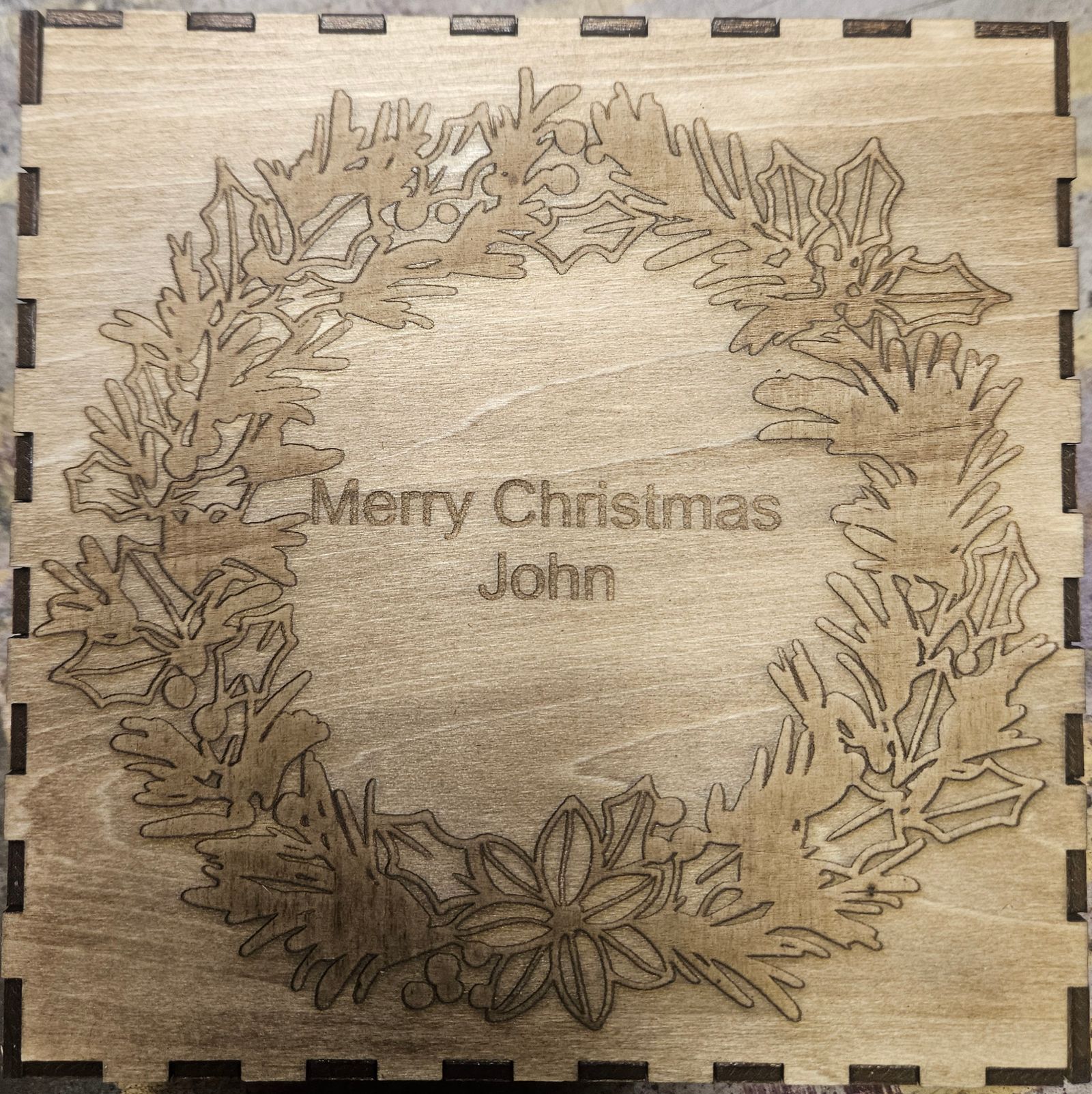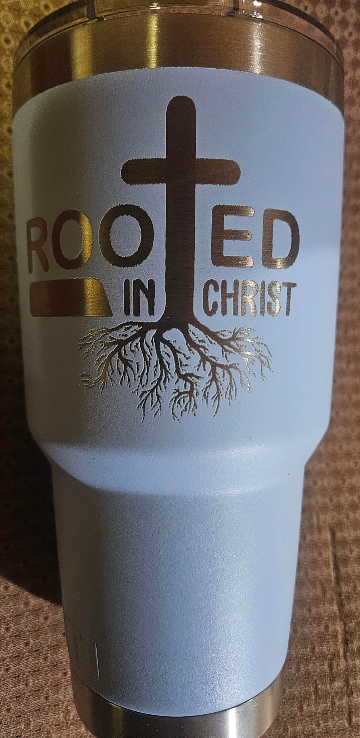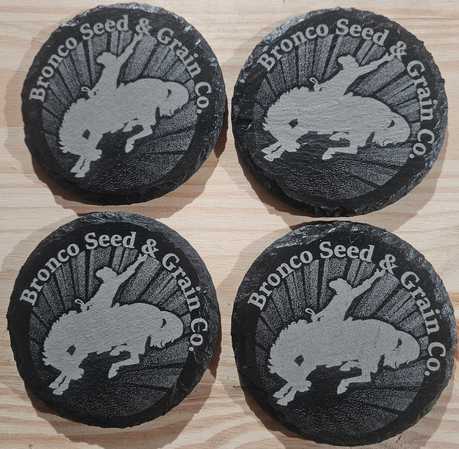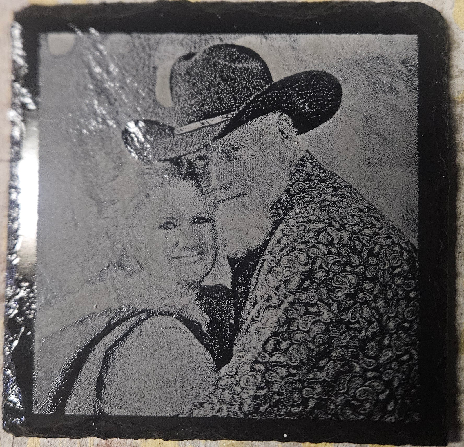 A close-up of a laser engraving machine working on a textured surface. The machine's laser emits a bright blue light, illuminating the surrounding area. The metal parts of the machine have labels and warning signs, and there are several metallic and plastic components visible.