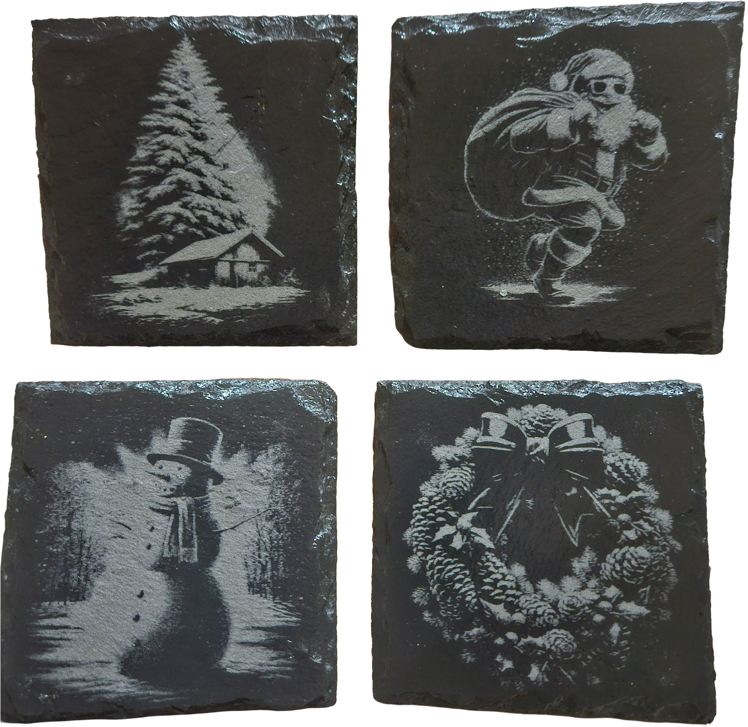 The festive designs—featuring iconic Christmas motifs such as Santa, snowmen, trees, and wreaths—are etched with precision, maintaining the elegance of the natural slate while adding a touch of seasonal charm.
